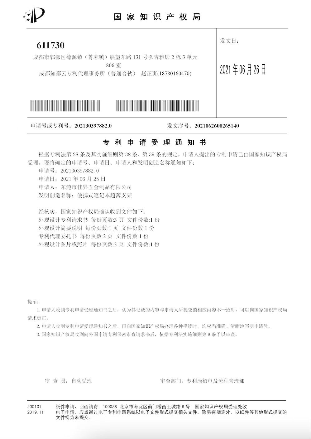 • 筆記本支架-五金專利證書